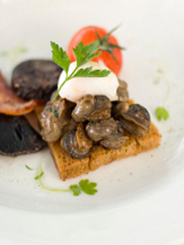 • When the snails are ready, put black pudding, bacon, mushroom and tomato under the grill to cook.