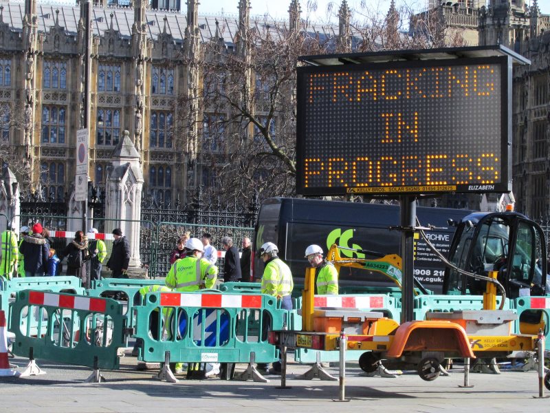 Greenpeace's 100% subsidiary Frack'n'go! sets up its rig in Parliament Square beneath the windows of the House of Commons, 9th February 2016. Photo: DAVID HOLT via Flickr (CC BY).