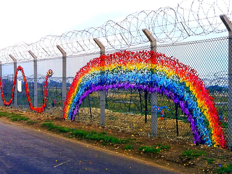 Rainbow-decorated fence at Greenham Common US military base near Newbury, England, 17th March 2007. Photo: Your Greenham via Flickr (CC BY-NC-SA).