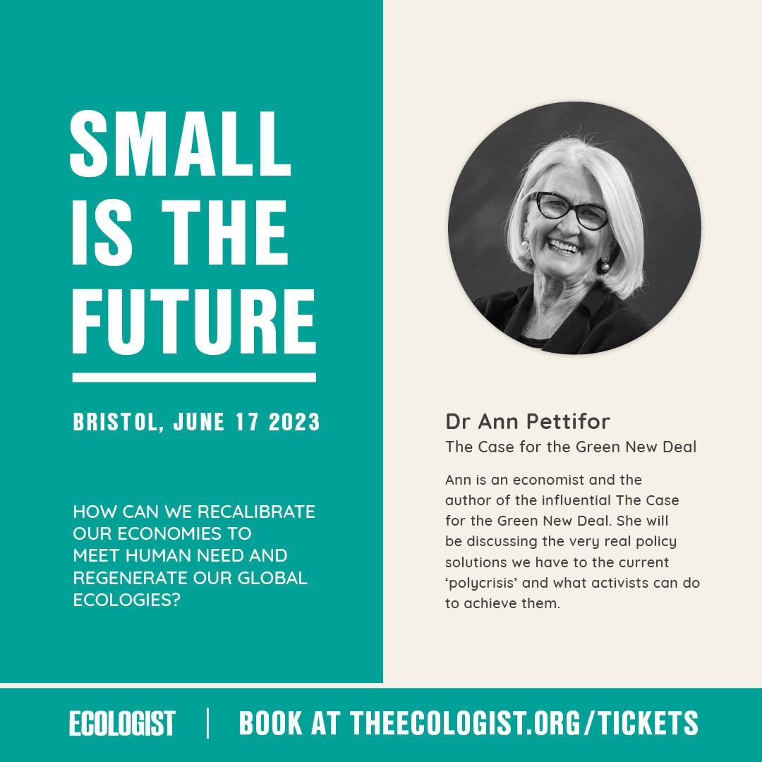 The SMALL IS THE FUTURE event is taking place on Saturday, 17 June 2023 at the Paintworks, Bristol. Speakers include Satish Kumar, Dr Ann Pettifor, Charlie Hertzog Young, Professor Herbert Girardet and Gareth Dale. Buy tickets here.