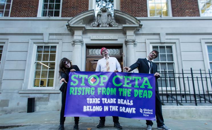 This morning (28 October) in London, protesters dressed as Hallowe'en Zombies posed outside the European Commission office in London with a banner saying "Stop CETA rising from the dead - Toxic trade deals belong in the grave."